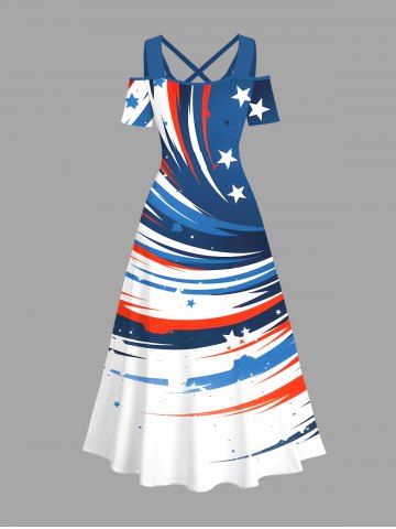Plus Size Patriotic American Flag Paint Splatter Print Cold Shoulder Crisscross Maxi Dress - White - 3x