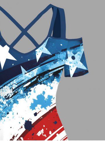 American Flag Dresses > Plus Size Patriotic American Flag Painting Splatter Print Cold Shoulder Crisscross A Line Maxi Dress