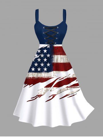 American Flag Dresses > Plus Size Patriotic American Flag Print Lace Up Panel Tank Dress