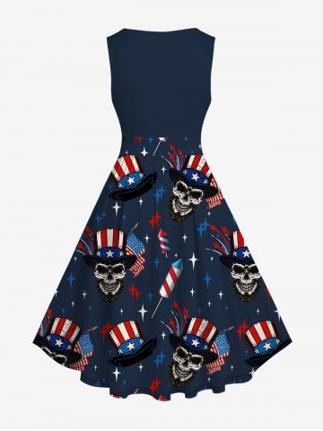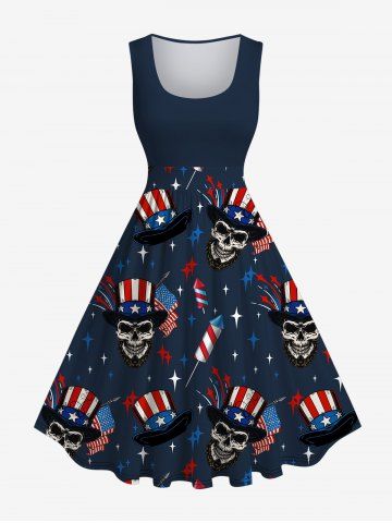Plus Size Patriotic American Flag Skulls Hat Star Print 1950s Vintage Dress - Midnight Blue - M