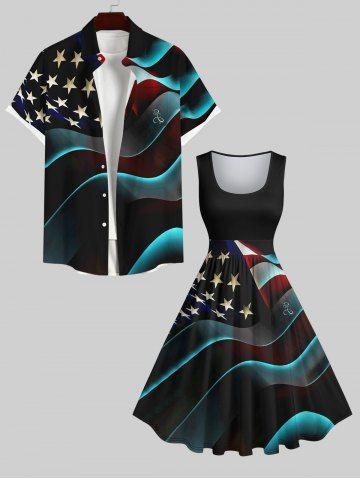 Plus Size Patriotic American Flag Star Glitter 3D Print 1950s Vintage Dress - Black - 4x