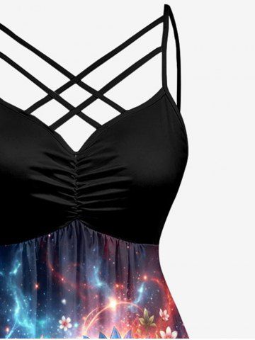 American Flag Dresses > Plus Size Patriotic American Flag Sunflowers Galaxy Glitter 3D Print Ruched Lattice Crisscross Straps Dress