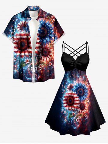 American Flag Dresses > Plus Size Patriotic American Flag Sunflowers Galaxy Glitter 3D Print Ruched Lattice Crisscross Straps Dress