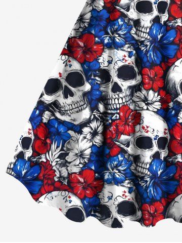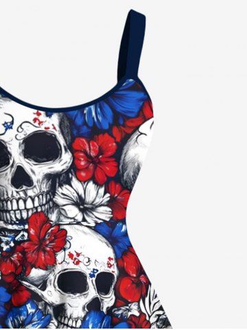 Plus Size Skulls Two Tone Floral Patriotic American Flag Print Hawaii A Line Tank Dress - Blue - 6x