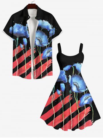 Plus Size Watercolor Ombre Floral Striped Painting Patriotic American Flag Print Backless A Line Tank Dress - Black - 6x