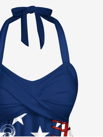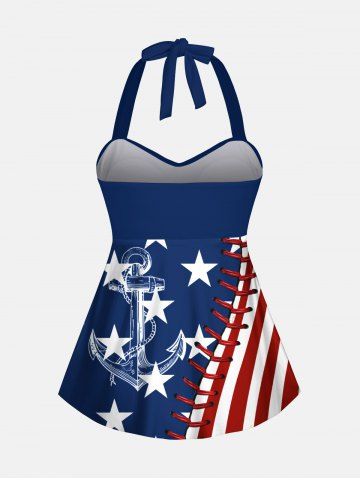 Patriotic American Flag Anchor 3D Topstitching Print Hawaii Cruise Twist Halter Backless Tankini Top - Blue - L