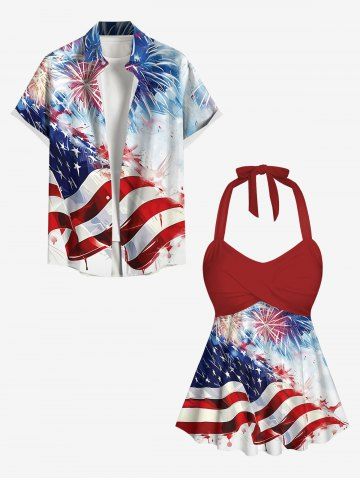 Patriotic American Flag Fireworks Print Twist Halter Backless Tankini Top - Red - S