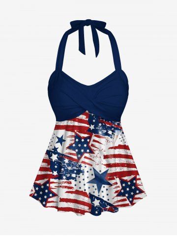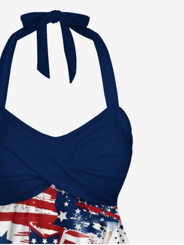 Patriotic American Flag Graffiti Print Twist Halter Backless Cinched Boyleg Tankini Swimsuit - Deep Blue - 3x