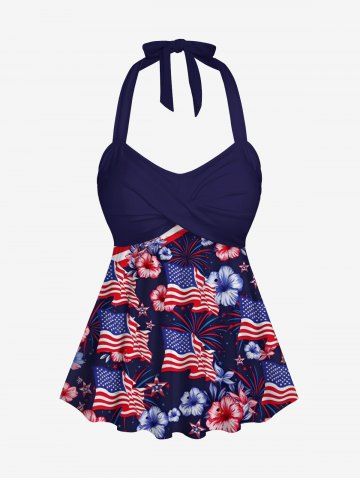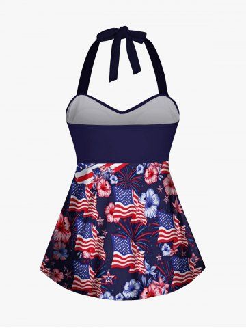 Plus Size Patriotic American Flag Hibiscus Flower Print Halter Boyleg Tankini Swimsuit - Deep Blue - S