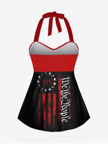 Plus Size Patriotic American Flag Print Halter Twist Cinched Tankini Swimsuit - Red - S
