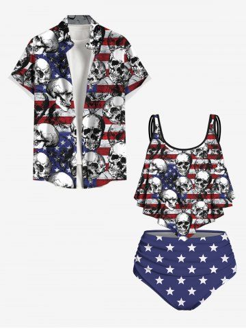 American Flag Swimwear > Plus Size Patriotic American Flag Skulls Print Overlay Ruched Tankini Swimsuit