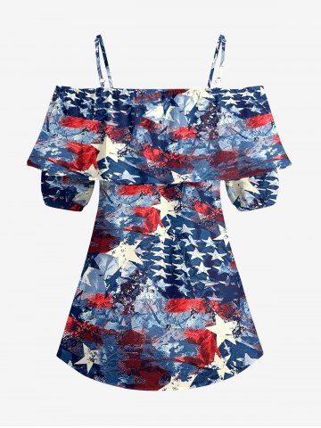 Plus Size Distressed Patriotic American Flag Print Cold Shoulder Ruffles Blouse - Deep Blue - L