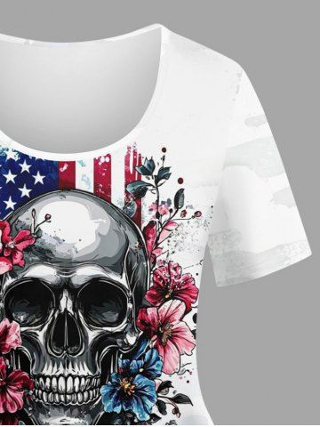 Plus Size Skulls Flower Patriotic American Flag Print T-shirt - White - S