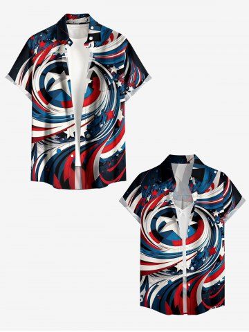 Women's Patriotic American Flag Swirl Print Buttons Pocket Shirt - Deep Blue - L