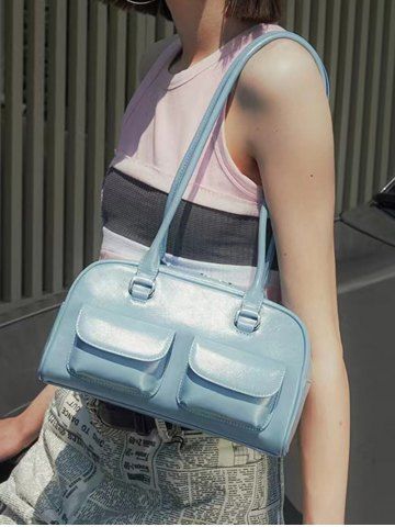 Women's Retro Style Daily Office Solid Color Multi-pocket Bowling Underarm Shoulder Bag - Blue