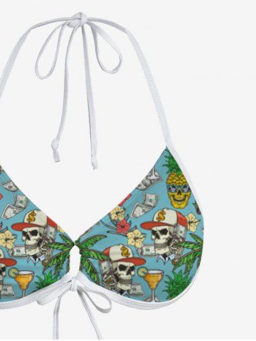 Bikini Tops > Coconut Tree Floral Skull Baseball Cap Pineapple Juice Print Hawaii Cinched Halter Backless Bikini Top