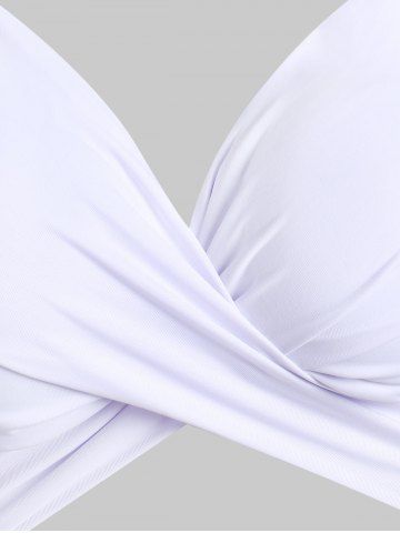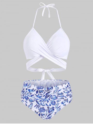 Flower Bird Pineapple Halter Criss Cross Tummy Control Bikini Swimwear - White - M