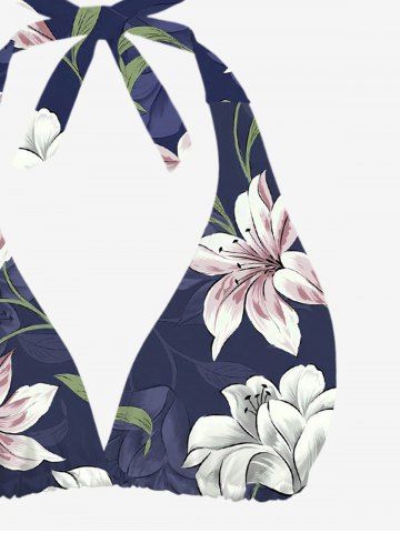 Flower Leaf Branch Print Hawaii Plunging Halter Backless Bikini Set - Cadetblue - 3xl