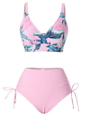 Surplice Leaf Print Bikini Swimwear - Light Pink - S