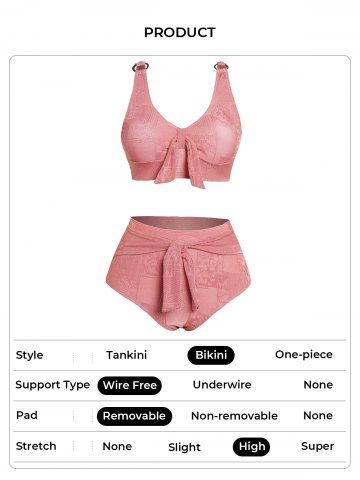 Vacation Plain Color Geometric Pattern Bowknot Padded Tummy Control Bikini Swimsuit - Light Pink - M