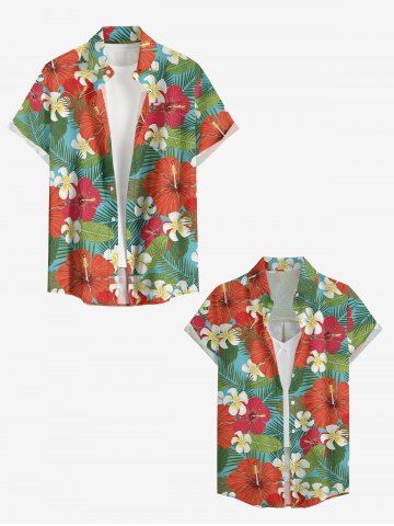 Plus Size Women Hibiscus Flower Tropical Leaf Print Buttons Pocket Hawaii Shirt - Red - S