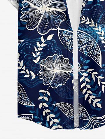 Women Flowers Leaf Print Buttons Pocket Hawaii Shirt - Deep Blue - 3xl