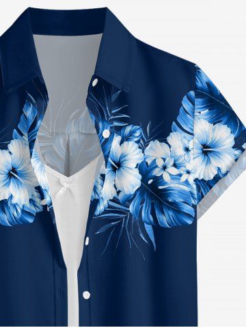 Women Hibiscus Flower Tropical Leaf Print Buttons Pocket Hawaii Shirt - Deep Blue - M