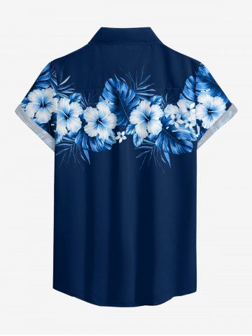 Women Hibiscus Flower Tropical Leaf Print Buttons Pocket Hawaii Shirt - Deep Blue - L