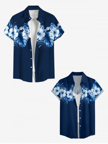 Women Hibiscus Flower Tropical Leaf Print Buttons Pocket Hawaii Shirt - Deep Blue - 2xl