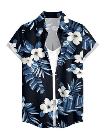 Women Hibiscus Flowers Tropical Leaf Print Buttons Pocket Hawaii Shirt - Blue - L