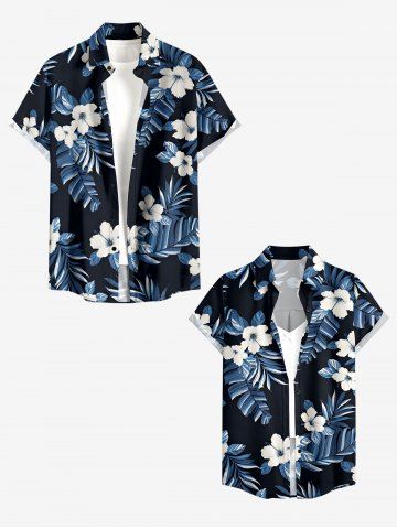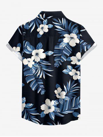 Women Hibiscus Flowers Tropical Leaf Print Buttons Pocket Hawaii Shirt - Blue - 3xl