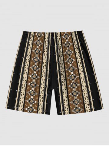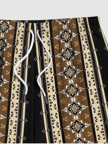 Hawaii Men's Striped Floral Print Drawstring Beach Shorts - Coffee - 7xl