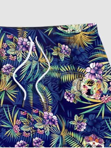 Plus Size Skull Floral Tropical Coconut Leaves Print Hawaii Drawstring Beach Shorts For Men - Blue - M