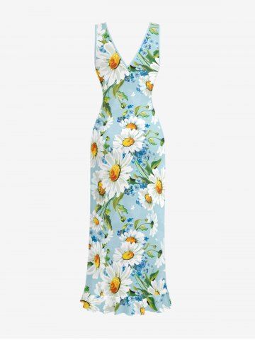 Daisy Flowers Leaf Print Hawaii Ruffles Split Surplice Dress - Powder Blue - S