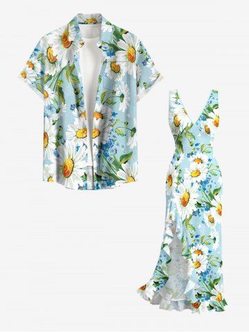 Daisy Flowers Leaf Print Hawaii Ruffles Split Surplice Dress - Powder Blue - Xxl