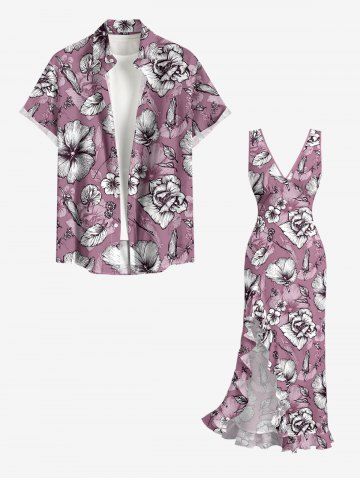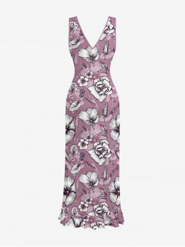 Flower Leaf Print Hawaii Ruffles Split Dress - Light Purple - S