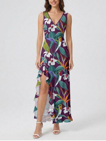 Bodycon Dresses > Flower Tropical Leaf Bird Print Hawaii Ruffles Split Dress