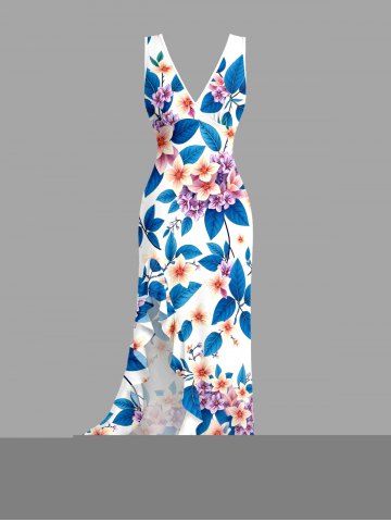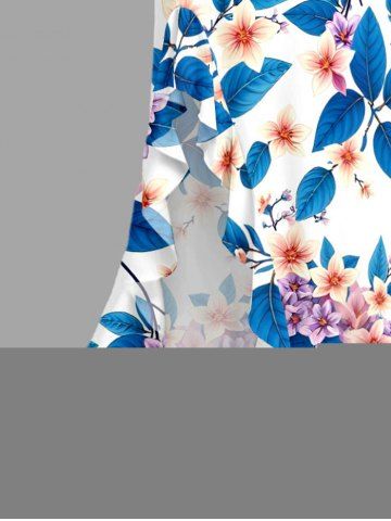 Flowers Leaf Print Hawaii Ruffles Split Surplice Dress - Blue - M