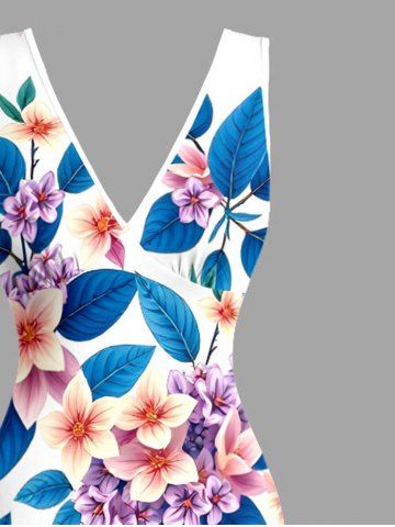 Flowers Leaf Print Hawaii Ruffles Split Surplice Dress - Blue - L