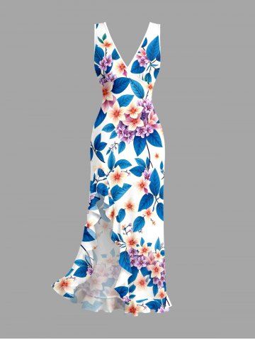 Flowers Leaf Print Hawaii Ruffles Split Surplice Dress - Blue - Xxxl