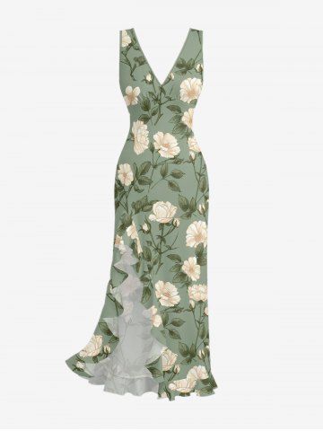 Flowers Leaf Print Hawaii Ruffles Split Surplice Dress - Light Green - Xxxl