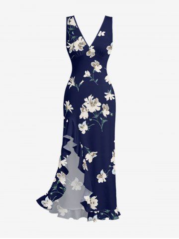 Flowers Leaf Print Hawaii Ruffles Split Surplice Dress - Deep Blue - Xxl