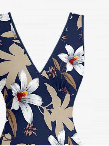 Flowers Leaf Print Hawaii Ruffles Split Surplice Dress - Deep Blue - L