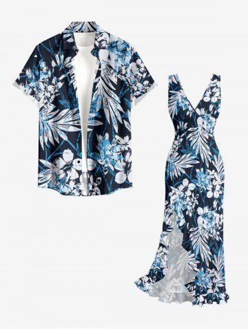 Flowers Leaf Print Hawaii Ruffles Split Surplice Dress - Lake Blue - Xs