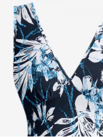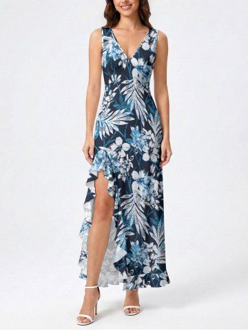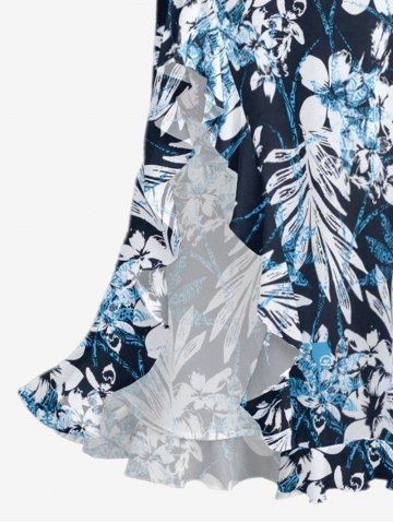 Flowers Leaf Print Hawaii Ruffles Split Surplice Dress - Lake Blue - L
