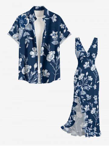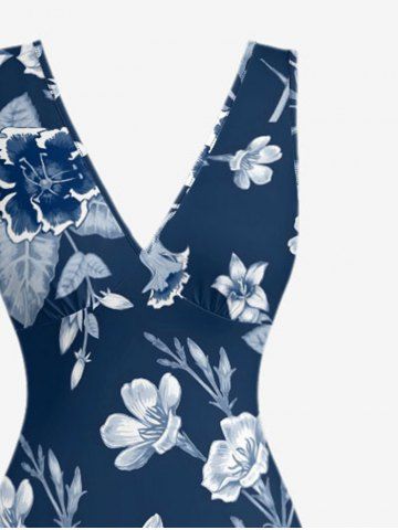 Flowers Leaf Print Hawaii Ruffles Split Surplice Dress - Cadetblue - Xs