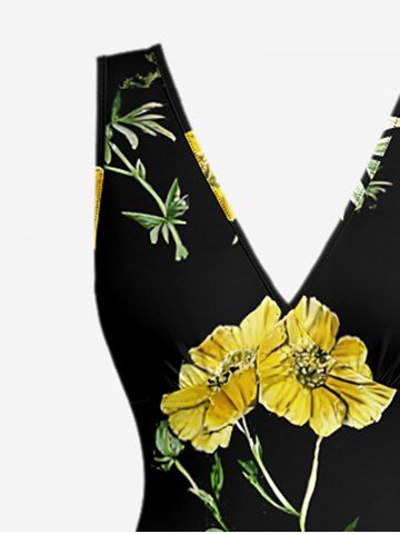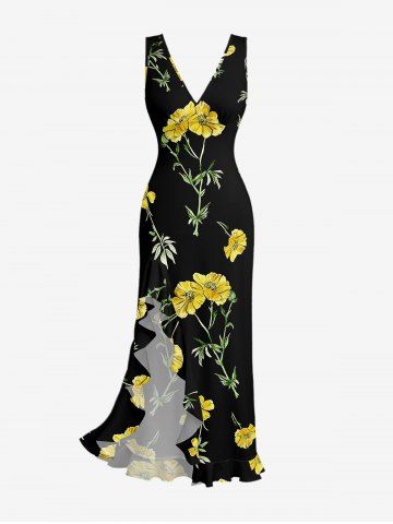 Flowers Leaf Print Hawaii Ruffles Split Surplice Dress - Black - S