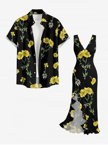 Flowers Leaf Print Hawaii Ruffles Split Surplice Dress - Black - L