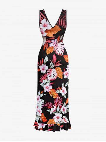 Bodycon Dresses > Flowers Leaf Tropical Print Hawaii Ruffles Split Surplice Dress