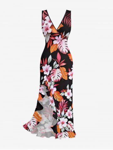 Bodycon Dresses > Flowers Leaf Tropical Print Hawaii Ruffles Split Surplice Dress